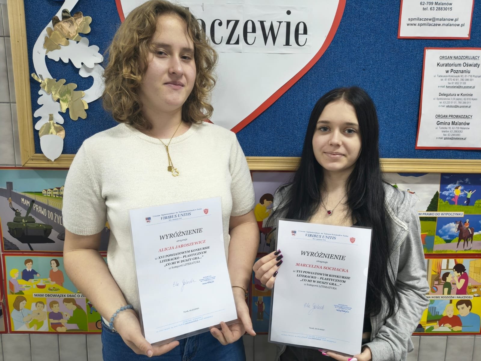 W dniu 2 grudnia 2025 r. w Liceum Ogólnokształcącym w Turku odbyło się uroczyste podsumowanie XVI edycji Powiatowego Konkursu Literacko-Plastycznego „Co mi w duszy gra…”. Wydarzenie to, od lat cieszące się dużym zainteresowaniem uczniów z całego powiatu, ma na celu kształtowanie wrażliwości estetycznej, rozwijanie kreatywności oraz zachęcanie młodych ludzi do twórczego i wartościowego spędzania wolnego czasu poprzez literaturę i sztukę. Z radością informujemy, że uczennice naszej szkoły – Alicja Jaroszewicz oraz Marcelina Sochacka – otrzymały wyróżnienia w kategorii pracy literackiej. Ich teksty zostały docenione za oryginalność, dojrzałość ujęcia tematu oraz ciekawy styl wypowiedzi. Laureatkom serdecznie gratulujemy i życzymy dalszych sukcesów, a także wielu inspiracji do rozwijania swoich pasji artystycznych.