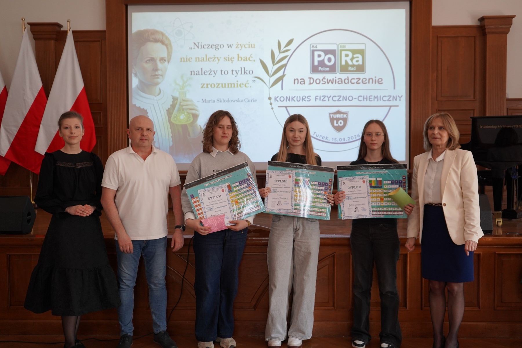 W dniu 15 marca w Liceum Ogólnokształcącym w Turku odbył się konkurs fizyczno – chemiczny dla szkół podstawowych. Jego celem było popularyzowanie nauki fizyki i chemii. Konkurs polegał na rywalizacji trzyosobowych drużyn, które mierzyły się z wymagającymi zadaniami z różnych dziedzin fizyki i chemii. Naszą szkołę reprezentowała drużyna uczennic z klasy VIII w składzie: Alicja Jaroszewicz, Julia Jaroszewicz, Wiktoria Płóciennik. Nasze reprezentantki spisały się znakomicie, zdobywając II miejsce spośród 10 drużyn. Gratulujemy uczennicom wspaniałego wyniku i życzymy im dalszych sukcesów.